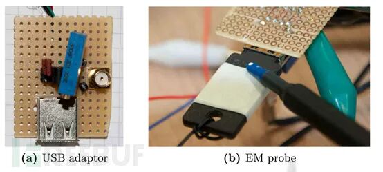 近年来,研究人员研究攻击者如何使用植入射频发射器的从普通的终端中窃取数据。这种方法需要一个硬改的USB插头或设备,还要有一个专用嵌入式的射频发射机。USBee是一款作为射频发射器发射电磁辐射的设备,对敏感数据进行编码/抓取等操作。当然如果无法接触到目标机器的时候,黑客可以用一根普通的电线触摸目标机器暴露的金属部分,得到的信号可以用来提取重要的密钥信息。Oswald等人展示了如何基于功耗和电磁辐射从Yubikey 2中提取AES 128位密钥。(Side-channel attacks on the yubikey2one-time password generator) Oswald
