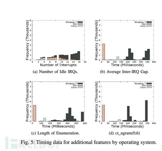 Usb嗅探的另一种方法是使用USB协议分析仪提取总线状态的时序特征,并使用机器学习分类来推断主机的操作系统,获取具体信息。Betas提出了一种基于时间间隔的指纹打印方案,该方案可以从商用智能电话启动。他们表明,特定的操作系统版本和型号可以以高达90%的准确度通过设备之间发送数据包的间隔来检测。尽管基于时序的指纹显着提高了规避漏洞的门槛,但是经验丰富的木马设计者可以修改其时序特征来逃避检测。